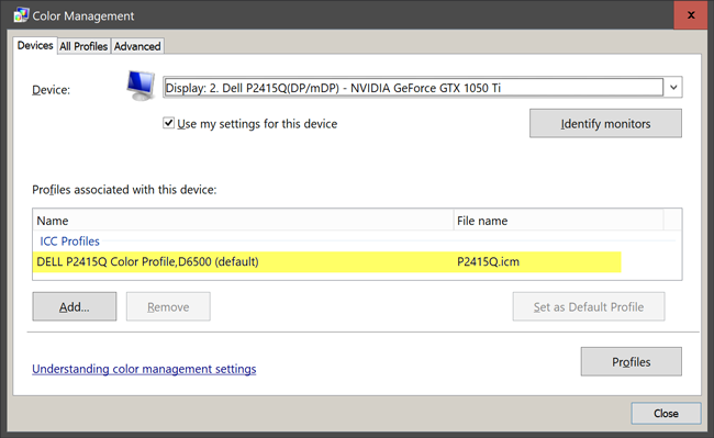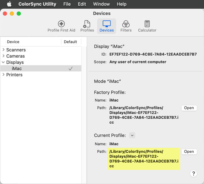 - In ColorSync, go to the Devices tab, then to Displays, then click on the display that you're currently using. The side panel will display the name and ID of the device. If the monitor is using anything other than an sRGB profile, then the side panel will also display the path to the color profile. It will look something like this. Take note of the path to the current profile.