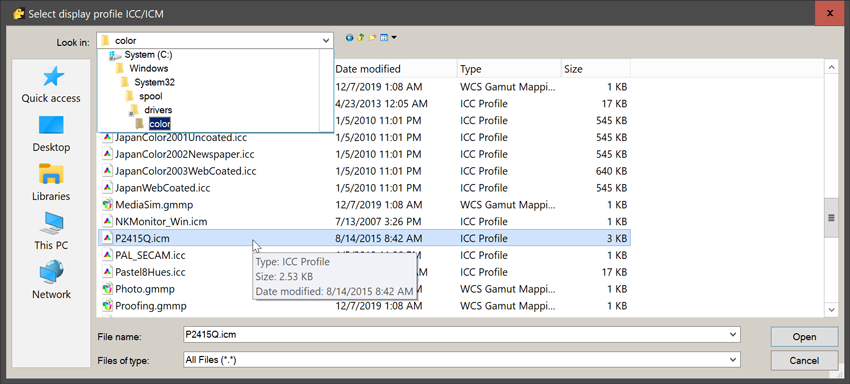 - Launch Zerene Stacker, go to Options > Preferences > Color Management, and click the Choose button. A new Explorer window will open up, in which you can navigate to and select the file indicated in the Windows Color Management panel. The file will probably be found in C:\Windows\System32\spool\drivers\color . That looks something like this: