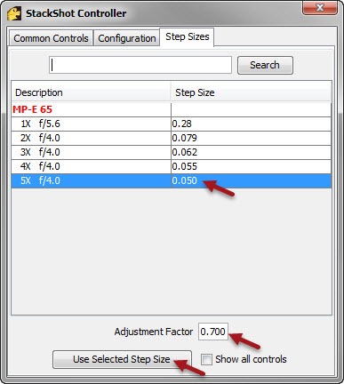 At this point, clicking on the row for “5X f/4.0”, with an Adjustment Factor of 0.700, then clicking on “Use Selected Step Size”, will immediately plug in the value 0.050 * 0.700 = 0.035 back on the Common Controls panel.