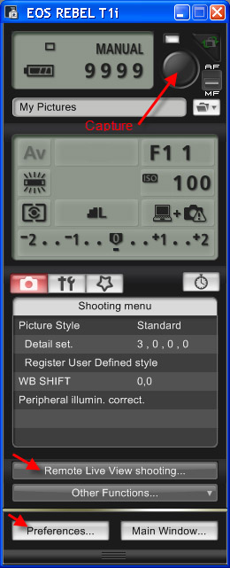 - If Canon EOS Utility opens into the Main Window, then select the Camera Settings / Remote Shooting option to bring up the camera controls window.
