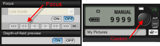 - If necessary, click the buttons to turn OFF auto focus (in the Focus panel) and to turn ON the Depth-of-field preview.