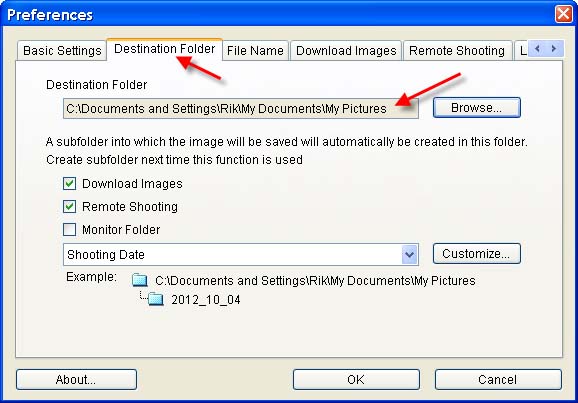 - In the camera controls window, press the Preferences button. In the preferences window select the Destination Folder tab and either set an appropriate location or at least make sure you know the current location. In the Basic Settings tab, you can also request that Canon EOS Utility start up showing the Camera Settings / Remote Shooting window, and whether to start EOS Utility automatically when the camera is connected and powered on.