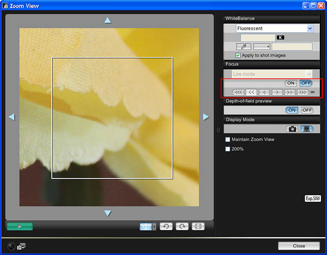 - If necessary, click the buttons in the Zoom View window to turn OFF auto focus (in the Focus panel) and to turn ON the Depth-of-field preview.