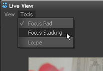 - In the Live View panel, select Tools > Focus Stacking. (Focus Stacking panel opens.)