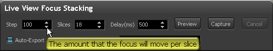 - In the Focus Stacking Panel, set the number of Slices and the number of lens focus steps per slice (“Step”). You make these adjustments by using the little up/down buttons next to each numeric field to set the Step, Slices, and Delay to the values that you want. (Note: you cannot type into these fields, or use the up/down keyboard keys. Pressing the little up/down buttons seems to be the only input that works. You can press-and-hold to make the values scroll pretty quickly.) At this point we're assuming that you have somehow chosen appropriate values for Step and Slices. More about that later. To start, just use Step: 100 and Slices: 10.