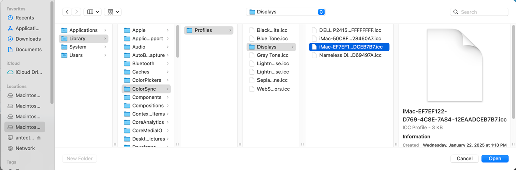 - In ColorSync, go to the Devices tab, then to Displays, then click on the display that you're currently using. The side panel will display the name and ID of the device. If the monitor is using anything other than an sRGB profile, then the side panel will also display the path to the color profile. It will look something like this. Take note of the path to the current profile.