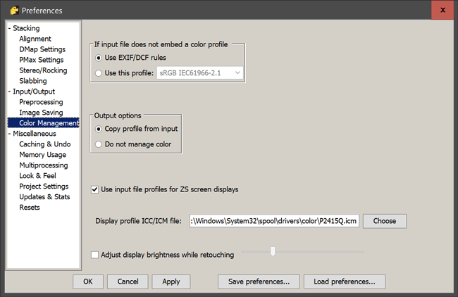 - “Display profile ICC/ICM file” specifies which profile Zerene Stacker should assume for the display monitor. This is mostly useful when using wide-gamut monitors, where assuming a standard sRGB profile can produce subtle (or not so subtle!) shifts in color balance, saturation, and contrast. Zerene Stacker cannot determine for itself what monitor profile is in use. You have to explicitly tell it that, using the procedure outlined below.
