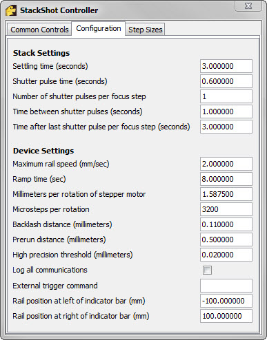 “Millimeters per rotation of stepper motor”, “Microsteps per rotation”, and “Backlash distance” describe the hardware. Shown here are values that correspond to a standard StackShot rail: 16 microsteps per each of 200 full steps per rotation, driving a 16-turns-per-inch screw. The backlash distance will vary from rail to rail and must be determined by experiment. Whatever values you need can be typed into these fields. For example, if a 0.9° stepper motor were used to drive a microscope focus block at 100 microns per rotation, then the proper settings would be 0.100 millimeters per rotation, 6400 microsteps per rotation, and backlash distance 0. In general, backlash distance should be adjusted so that when you rock the nominal rail position back and forth by a small amount using the focus knobs, the physical rail position changes by a similar amount. This setting will facilitate moving the rail to determine start/end positions of the stack. Two procedures for calibrating backlash are given HERE.