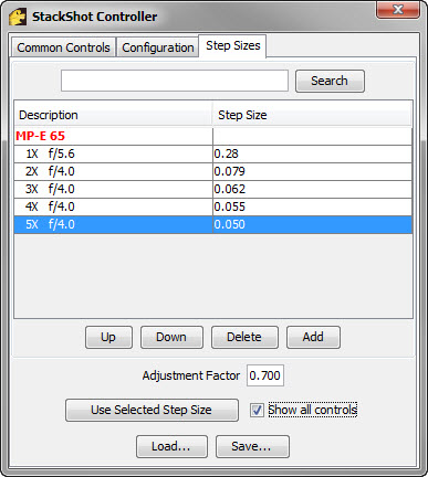 At this point, clicking on the row for “5X f/4.0”, with an Adjustment Factor of 0.700, then clicking on “Use Selected Step Size”, will immediately plug in the value 0.050 * 0.700 = 0.035 back on the Common Controls panel.