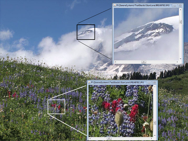 At this scale you see the problem. These pictures were taken with the lens set to its sharpest aperture. But there's not nearly enough depth of field at that aperture to cover both the foreground flowers and the background mountain.
