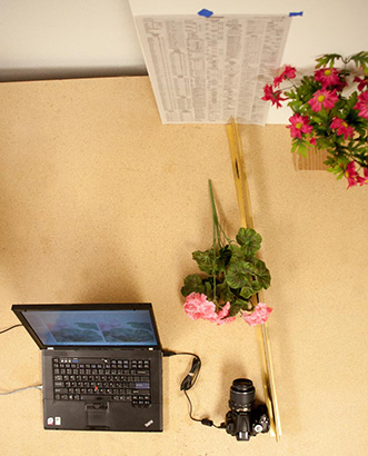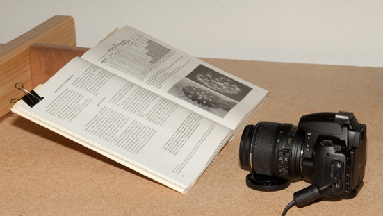 - Set up a piece of paper containing fine text, slanted steeply with respect to the lens.